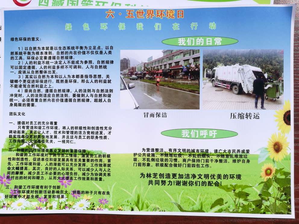 2017年6月5日,在林芝市巴宜區(qū)廈門廣場(chǎng)開展《六五世界環(huán)境日》環(huán)保宣傳活動(dòng),——“青山綠水便是金山銀山”,呼吁廣大市民、游客等廣大群眾參與保護(hù)雪域高原最后的碧水藍(lán)天;此次活動(dòng)由林芝市環(huán)保局牽頭組織舉辦,參與活動(dòng)單位:林芝市市政管理局、西藏國(guó)策環(huán)保科技股份有限公司林芝分公司、林芝市農(nóng)牧局、林芝市國(guó)土資源局、林芝市發(fā)改委、中國(guó)華能、巴宜區(qū)環(huán)保局、林芝市商務(wù)局、林芝市科技局、林芝市林業(yè)局等單位?;顒?dòng)現(xiàn)場(chǎng)也聚集市民、游客等參與環(huán)保宣傳和學(xué)習(xí)環(huán)保知識(shí)。