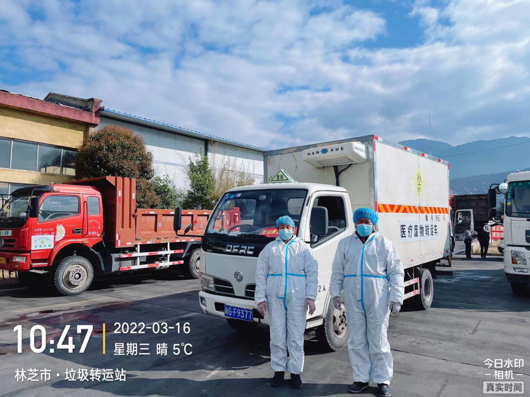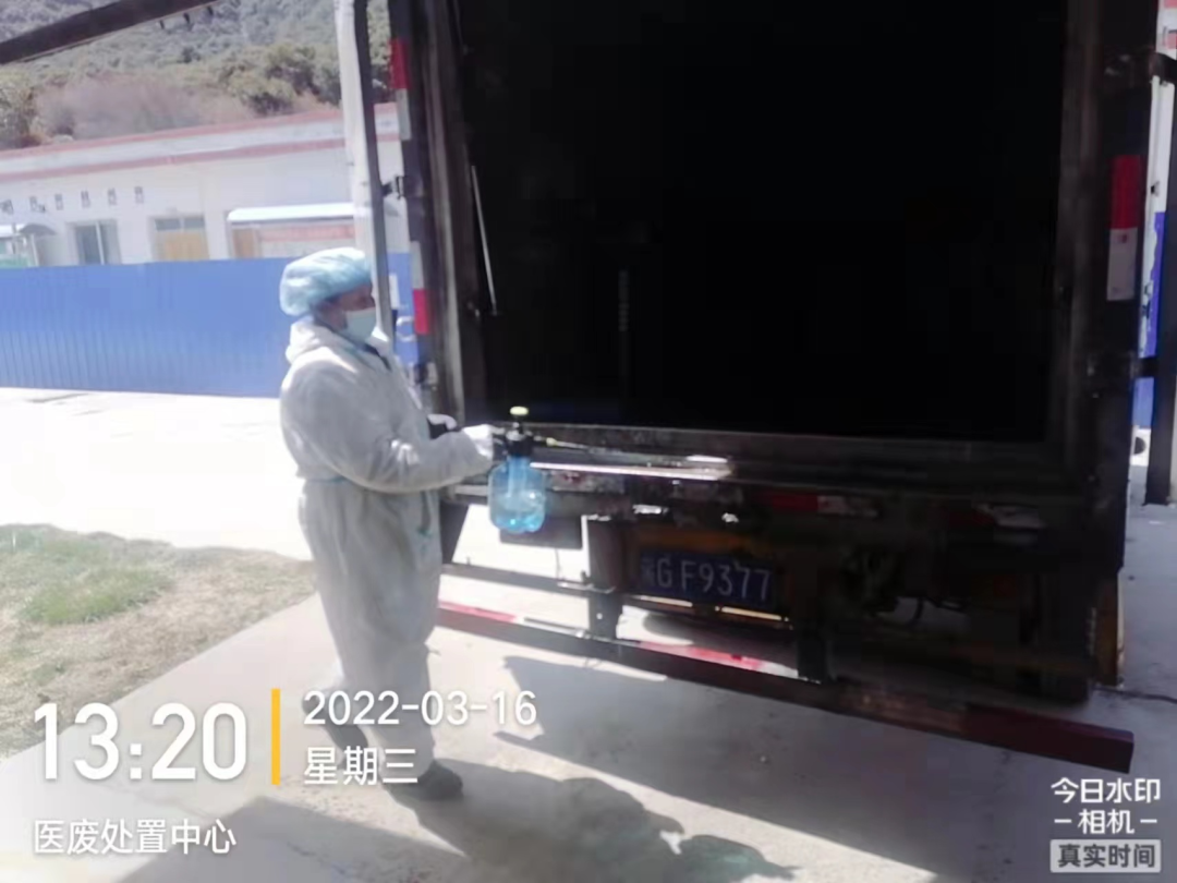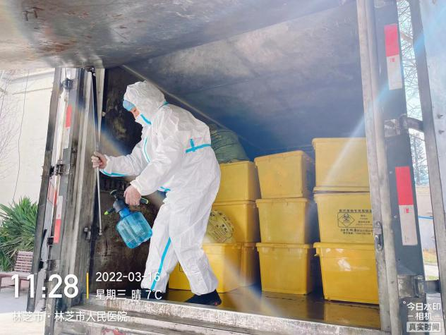 2、消殺完畢后,立即出發(fā)前往林芝市新冠定點(diǎn)醫(yī)院(林芝市人民醫(yī)院)收集轉(zhuǎn)運(yùn)新冠相關(guān)醫(yī)療廢物,與林芝市人民醫(yī)院醫(yī)廢暫存間工作人員確認(rèn)稱重并規(guī)范填寫危險(xiǎn)廢物轉(zhuǎn)運(yùn)聯(lián)單,收集完畢后對(duì)轉(zhuǎn)運(yùn)車內(nèi)外進(jìn)行消殺;